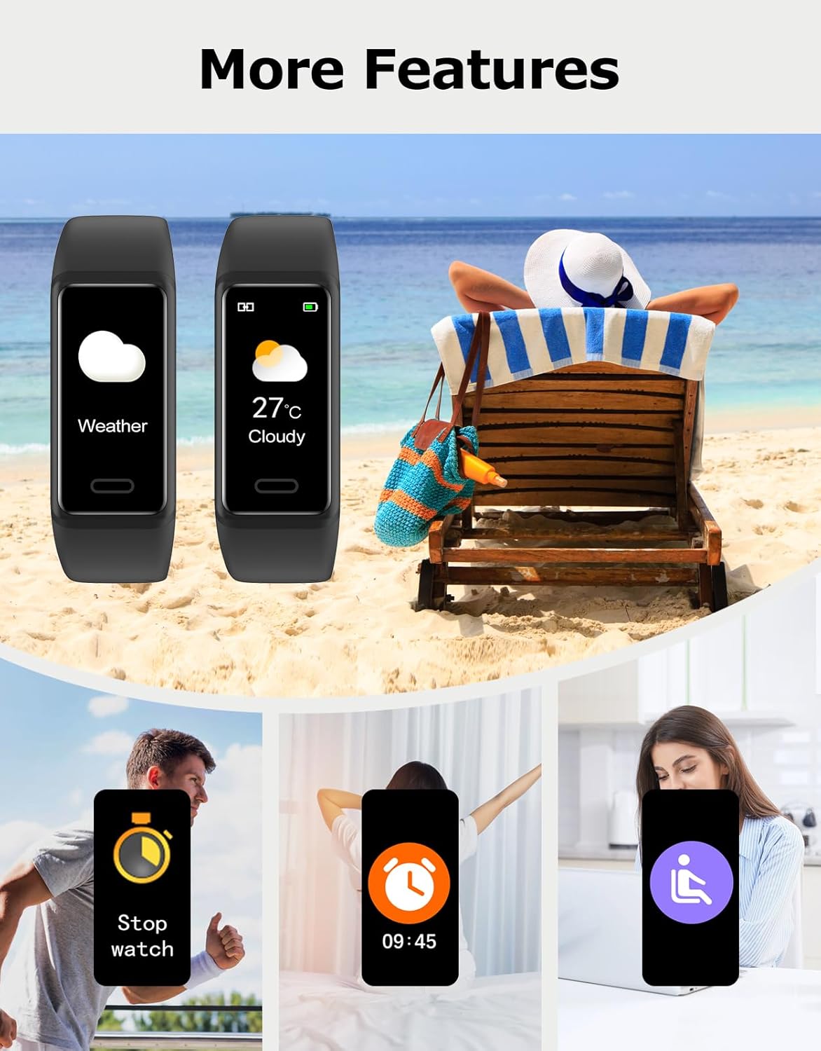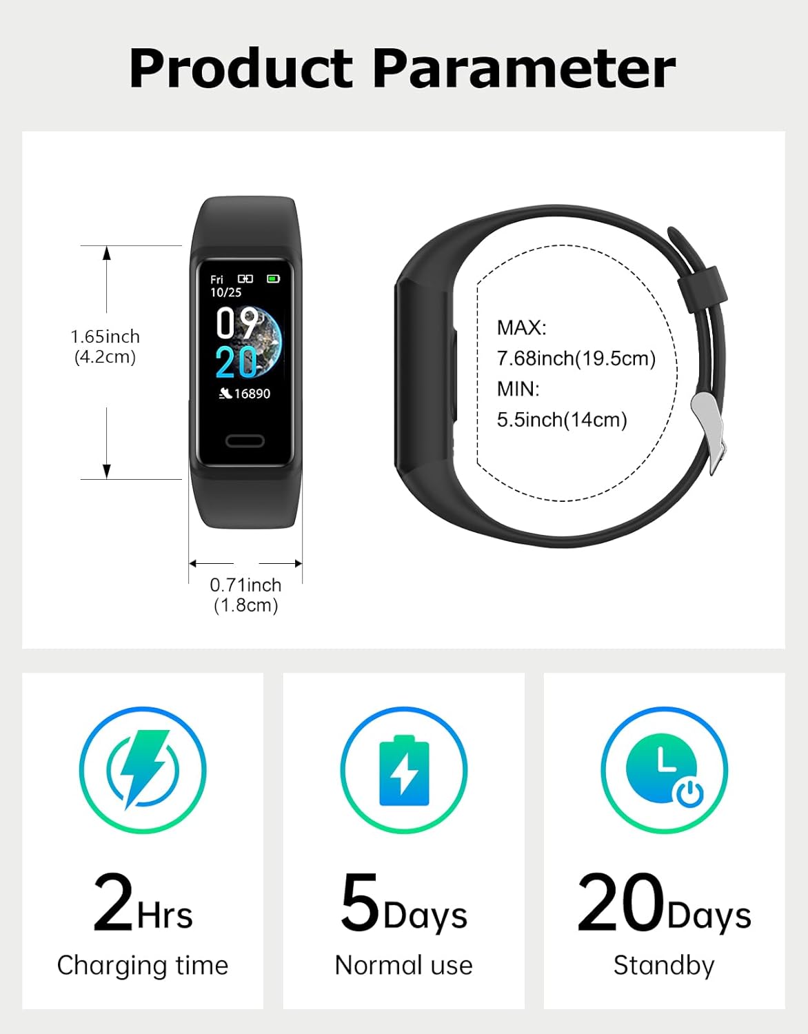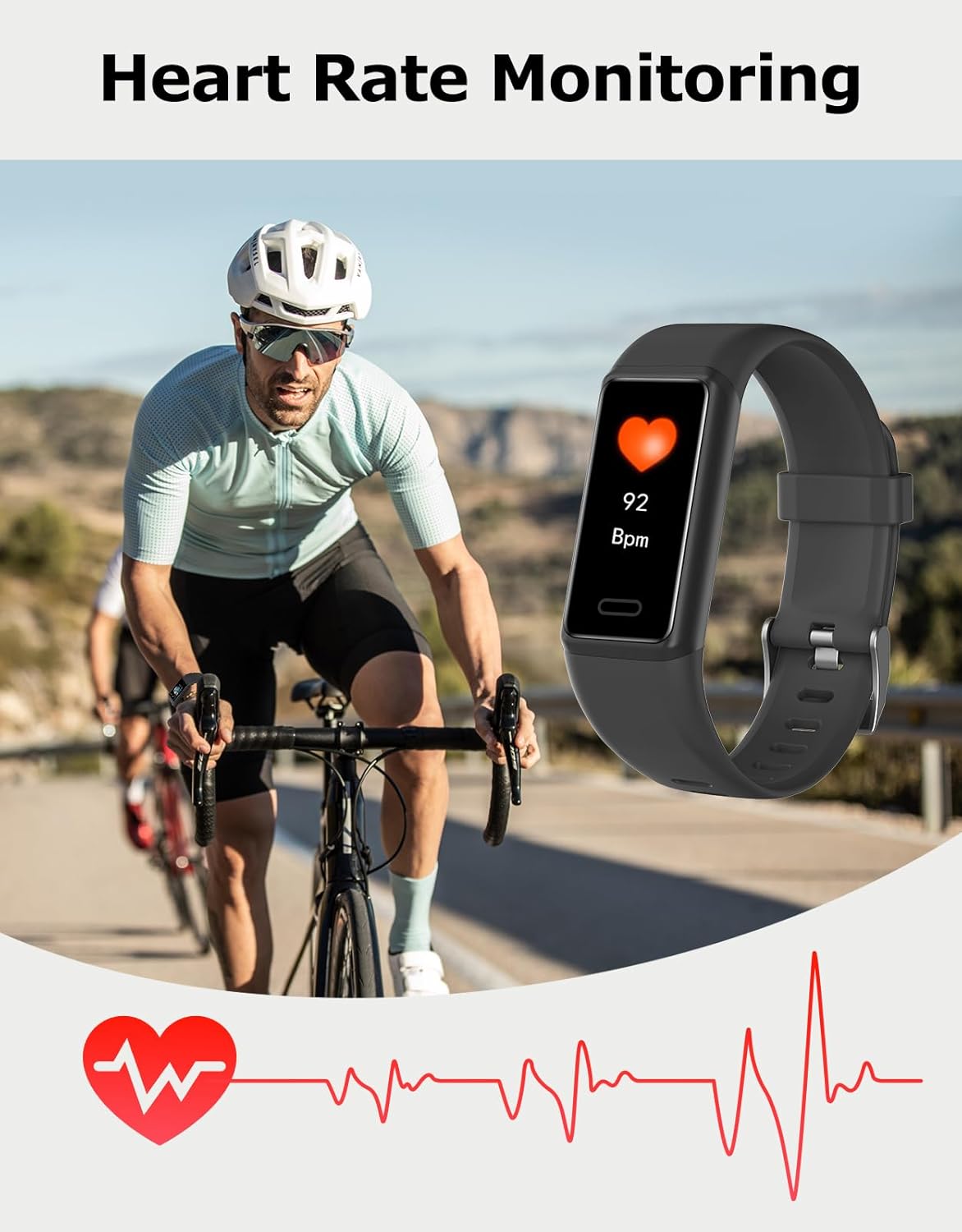 Stay on top of your fitness goals with the sleek and reliable Fitness Tracker. Designed for both men and women, this Pedometer Watch features a 24/7 Heart Rate Monitor, Sleep Tracker, Step and Calorie Counter, Stopwatch, and IP68 Waterproof rating for all-day activity tracking.